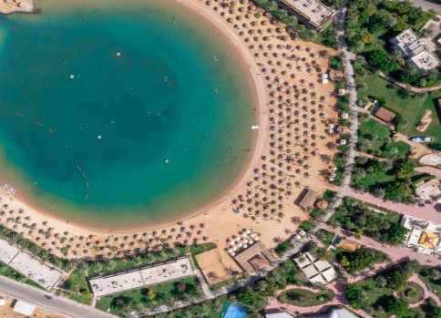 Desert Rose 5* разполага със собствен девствен пясъчен плаж с дължина от 1км, с 40 000 м² природна лагуна със златист пясък. Хотелът предлага на своите клиенти идеална атмосфера за забавления или просто да се насладят на прекрасния ненадминат климат на Червено море. Хотелът разполага с 4 плувни басейна, 1 с олимпийски размери, голям плувен басейн с палуби за слънчеви бани и бар край него, отопляем семеен плувен басейн и детски плувен басейн, специализиран за бебета и малки деца със собствен мини душ и мини столове. Като допълнение Аквапаркът предлага още и 6 водни пързалки.