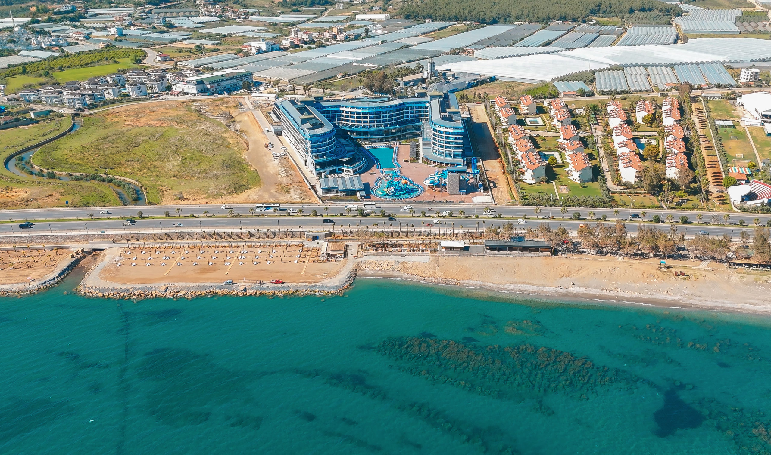 Намира се на 100 км от летище Анталия, на 110 км от центъра на Анталия, на 18 км от центъра на Алания, на 250 м от брега на морето, чрез подлез. Построен 2024 г., на обща площ от 43 000 м2. Достъп до Еftalia Island, разположен на плажа, състоящ се от аквапарк с басейни, водни пързалки и заведения.